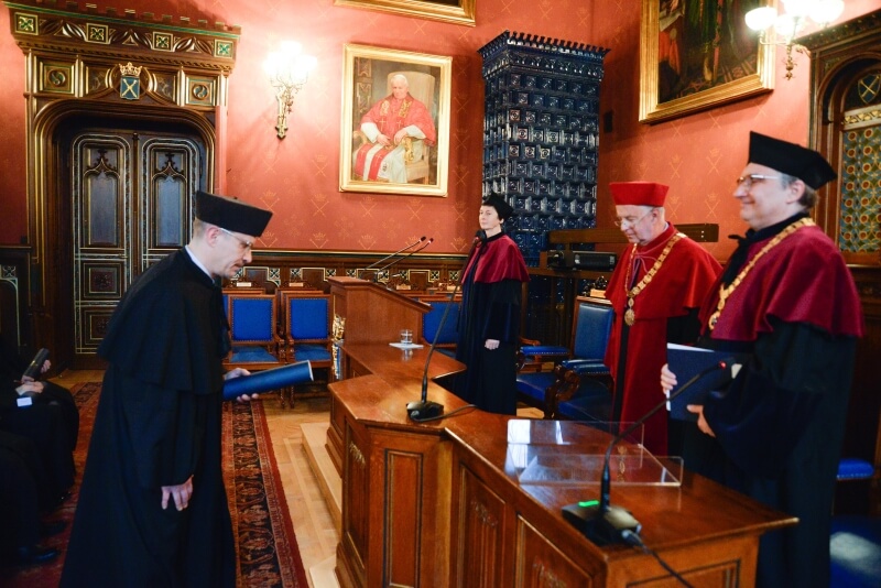 Dr. pharm. Paul Klin bei der Verleihung seiner Doktor-Promotionsurkunde. Jagiellonen-Universität, Krakau, Polen. 15 Januar 2024.